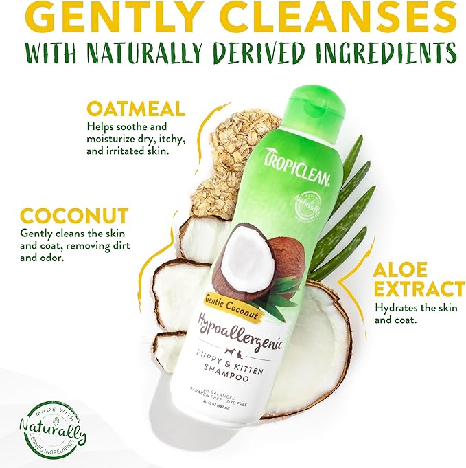 - GENTLE CLEANSING – TropiClean hypoallergenic shampoo for dogs is gentle enough for puppies and kittens with a moisturizing cleanse and a subtle, long-lasting coconut scent.