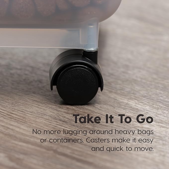 - ROLL IT AROUND: The storage bins come with attachable casters, so you have the option to have them off or on. Store it on a shelf or attach the wheel to roll it from the storage area to your dog or cat bowl