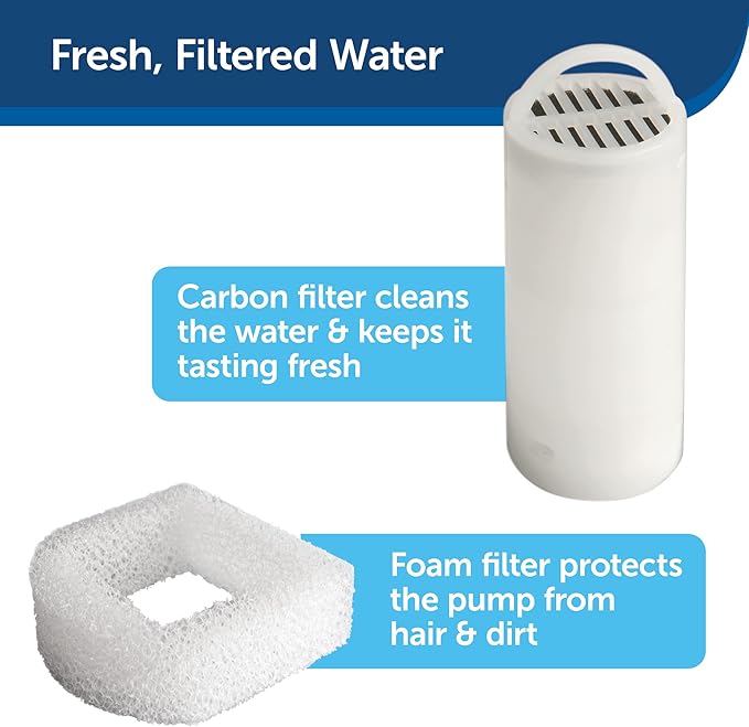 - FRESH, FLOWING WATER: Replaceable carbon filter refreshes water and the foam filter catches pet hair and debris to keep your cat’s water clean