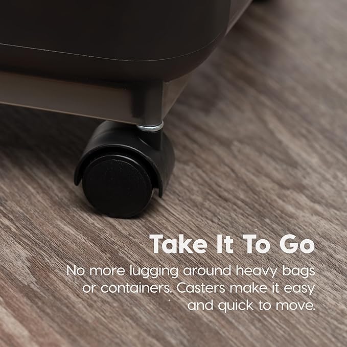- ROLL IT AROUND: The storage bins come with attachable casters, so you have the option to have them off or on. Store it on a shelf or attach the wheel to roll it from the storage area to your dog or cat bowl