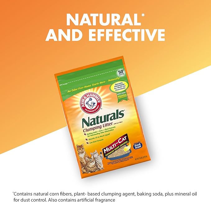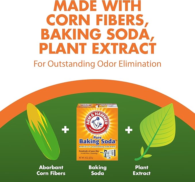 - OUTSTANDING ODOR ELIMINATION WITH NATURAL INGREDIENTS. The power of ARM HAMMER Baking Soda + Corn + Plant extracts deliver superior odor control for multi-cat households. Natural clumping cat litter destroys the toughest kitty litter box odors.