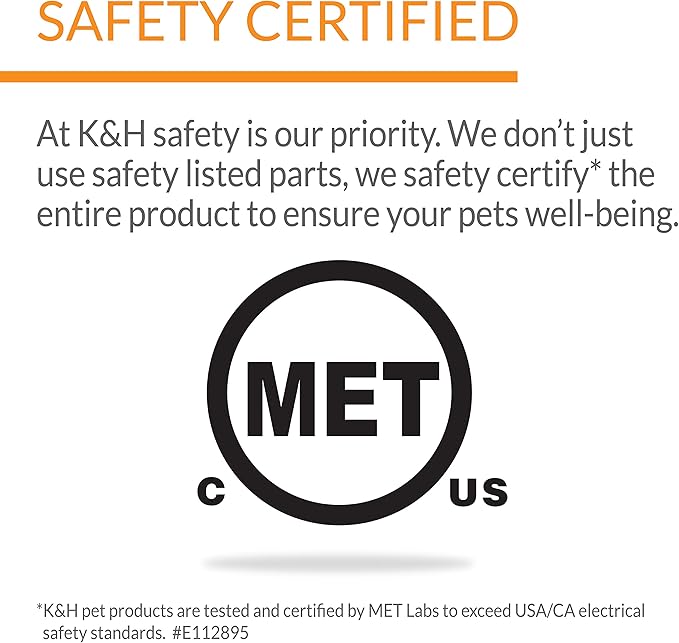 - Safety is our priority at K&H; we don't just use safety listed parts, we certify the entire product to ensure your safety - K&H Pet Products are tested & certified by MET Labs to exceed USA/CA electrical safety standards