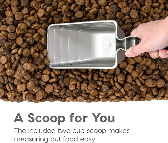 • CONTENTS: 11 lbs / 12 Qt storage container securely stacks on the 30 lbs / 33 Qt storage container, one matching 2-cup food scoop, and one set of wheels. Included scoop makes measuring food easy and attachable casters make it easy to roll it around.