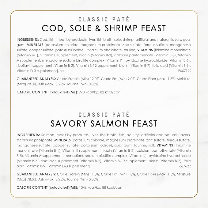 - Canned cat food variety pack featuring Cod, Sole and Shrimp, Savory Salmon or ocean whitefish and tuna as the number one ingredient