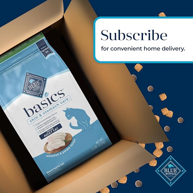 - Contains: One (1) 5-lb. bag of BLUE Basics Skin & Stomach Care Grain-Free Dry Cat Food, Whitefish & Potato