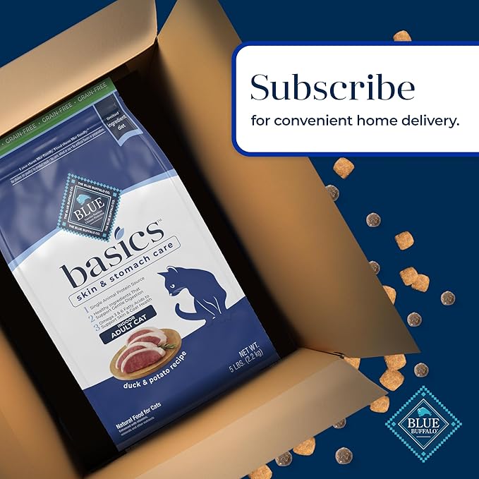 - Contains: One (1) 5-lb. bag of BLUE Basics Skin & Stomach Care Grain-Free Dry Cat Food, Duck & Potato