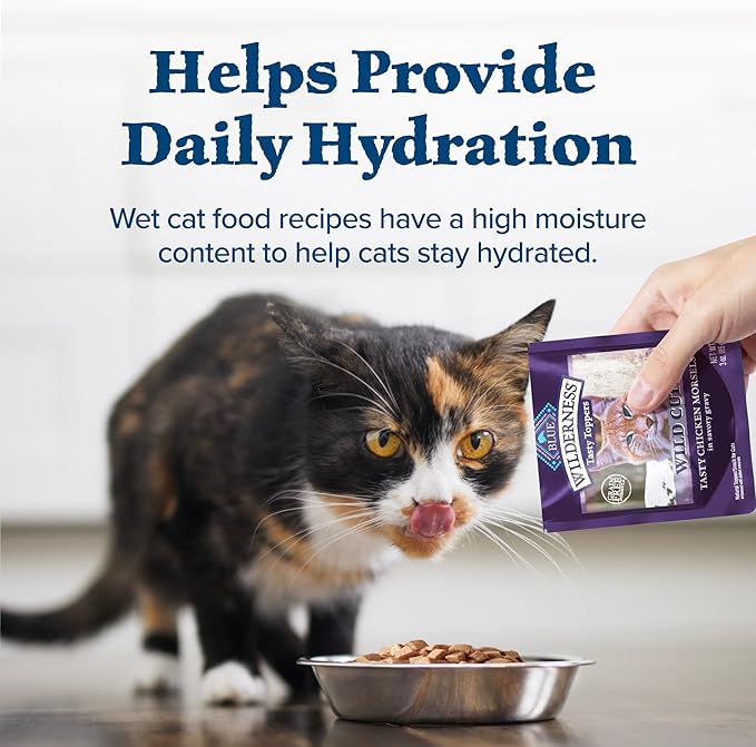 - Contains: Twenty-four (24) 3-oz. pouches of BLUE Wilderness High-Protein Grain-Free Wet Cat Food, Wild Cuts Chicken Recipe