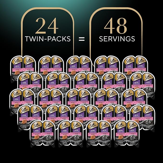- 24 Twin-Pack Trays: Contains twenty-four (24) 2.6 oz. twin-pack trays of Sheba Perfect Portions Wet Cat Food Pate With Sustainable Salmon (24 Count, 48 Servings)