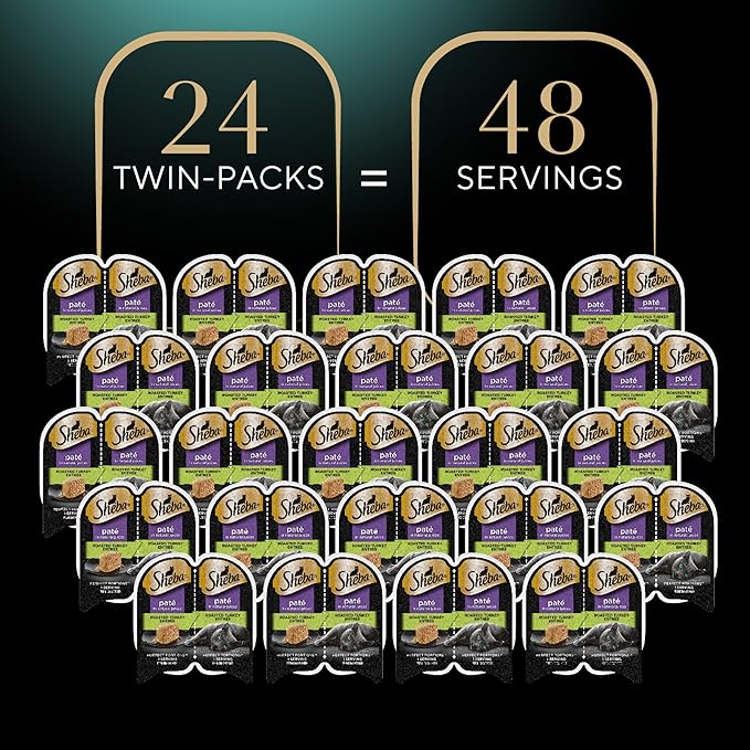 - 24 Twin-Pack Trays: Contains twenty-four (24) 2.6 oz. twin-pack trays of Sheba Perfect Portions Wet Cat Food Pate Roasted Turkey Entree (24 Count, 48 Servings)