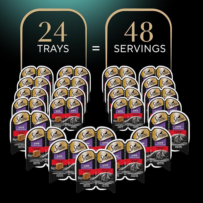 - 24 Twin-Pack Trays: Contains twenty-four (24) 2.6 oz. twin-pack trays of Sheba Perfect Portions Wet Cat Food Pate Tender Beef Entree (24 Count, 48 Servings)