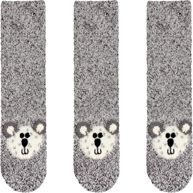 - FUZZY ANIMAL CREW SOCKS 3 Pairs of Super Soft Warm Cozy Furry Animal Non-slip All Season Crew Socks, Style 04 Grey Bear 🐻