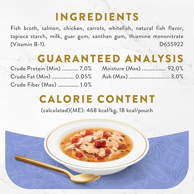 - With salmon and whitefish, this broth for cats is part of the complete line of Purina Fancy Feast gourmet toppers