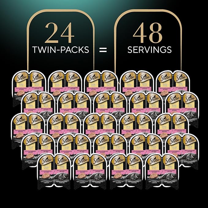 - 24-Pack: Contains twenty-four (24) 2.6 oz. twin-pack trays (48 servings total) of Sheba Perfect Portions Wet Cat Food Cuts in Gravy With Sustainable Salmon