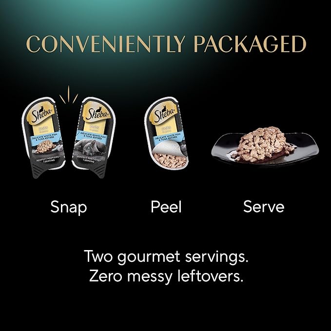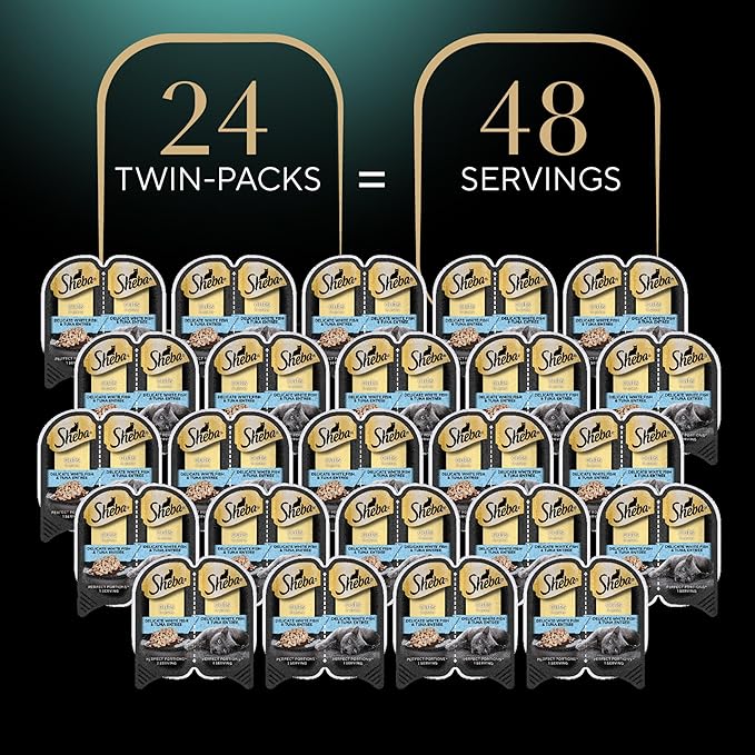 - 24-Pack: Contains twenty-four (24) 2.6 oz. twin-pack trays (48 servings total) of Sheba Perfect Portions Wet Cat Food Cuts in Gravy Delicate White Fish & Tuna Entree