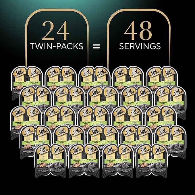 - 24-Pack: Contains twenty-four (24) 2.6 oz. twin-pack trays (48 servings total) of Sheba Perfect Portions Wet Cat Food Cuts in Gravy Tender Turkey Entree