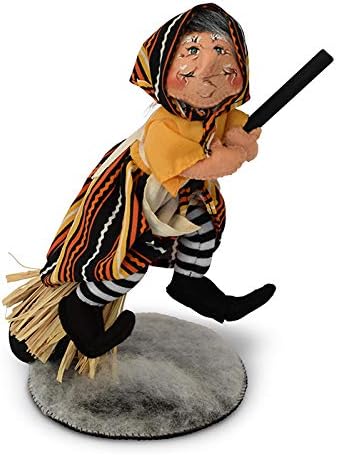 - This 9 inch witch is taking flight on a black wooden spoon covered with raffia. It is placed upon a wire frame base for stability and the witch is perched upon it in flight.