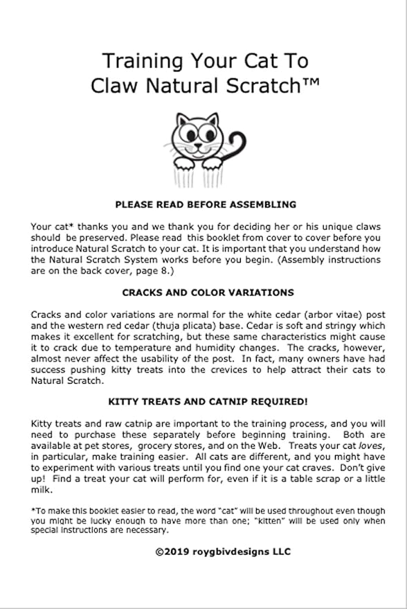 - Easy-to-read-and-use training booklet. Offer your cat's favorite treat as a reward and use the included method to train her or him to claw Natural Scratch and nothing else.