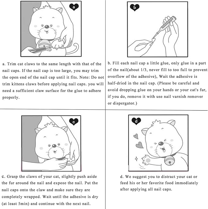- 【How To Use】1. Trim cat nails(Kitten Paws DO NOT need to be trimmed). 2. Fill a little glue into caps(Note: not too much). 3. Wait a moment when the glue is half dry, put it on your cat. 4. Until the glue is complete dry then begin the next.