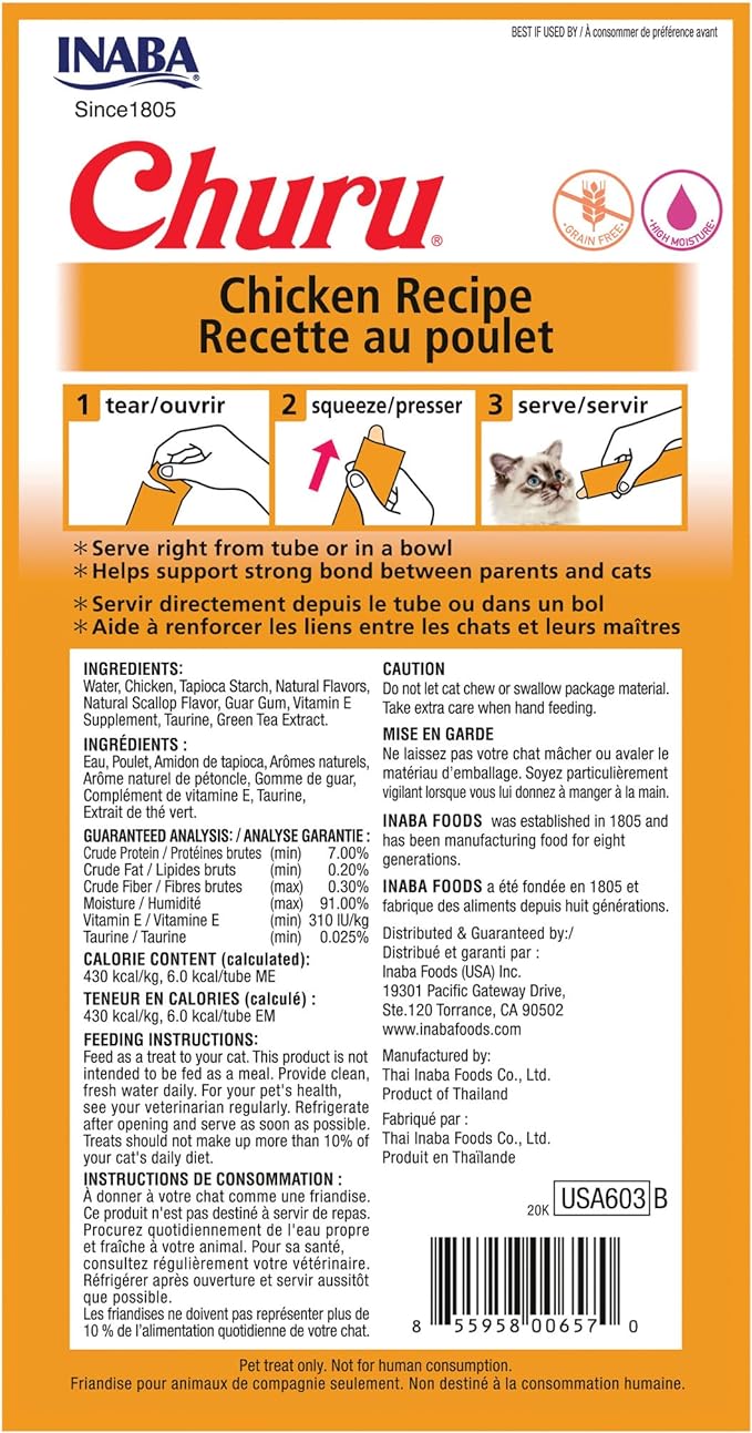 INABA Churu Cat Treats, Grain-Free, Lickable, Squeezable Creamy Purée Cat Treat/Topper with Vitamin E & Taurine, 0.5 Ounces Each Tube, 24 Tubes (4 per Pack), Chicken Recipe