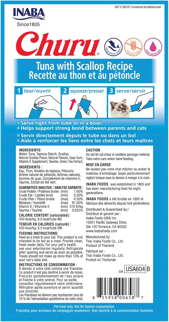INABA Churu Cat Treats, Grain-Free, Lickable, Squeezable Creamy Purée Cat Treat/Topper with Vitamin E & Taurine, 0.5 Ounces Each Tube, 24 Tubes (4 per Pack), Tuna with Scallop Recipe