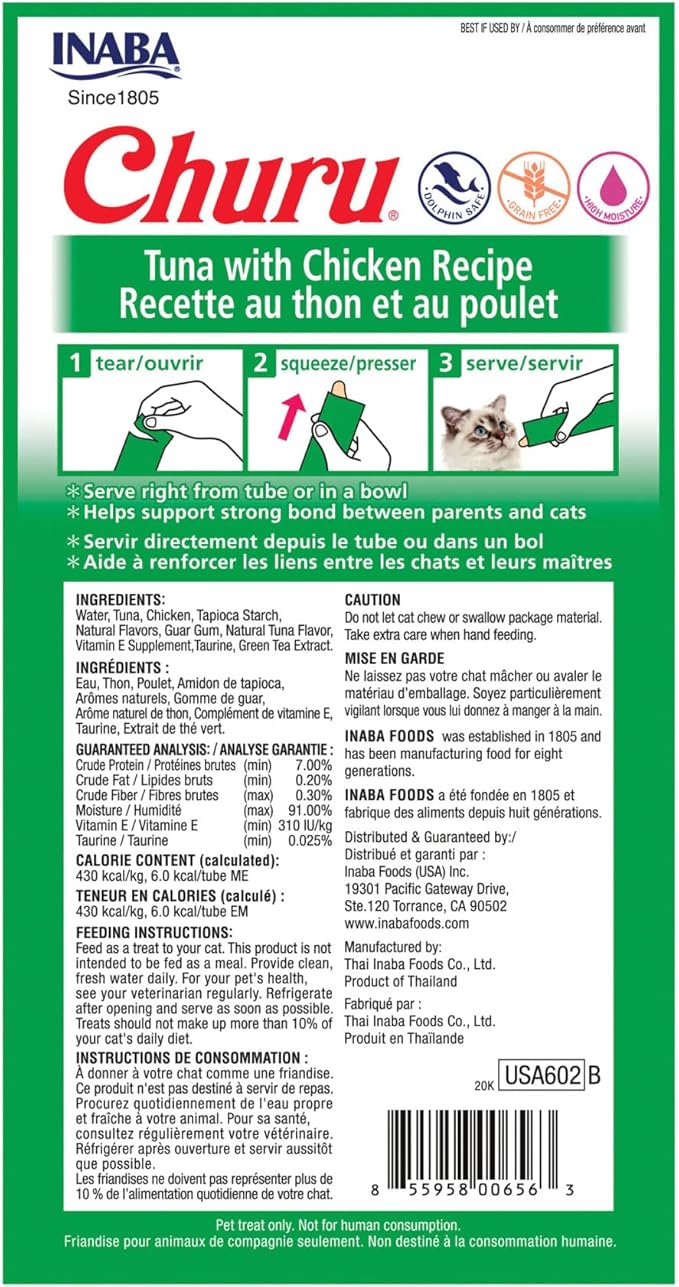 INABA Churu Cat Treats, Grain-Free, Lickable, Squeezable Creamy Purée Cat Treat/Topper with Vitamin E & Taurine, 0.5 Ounces Each Tube, 24 Tubes (4 per Pack), Tuna with Chicken Recipe