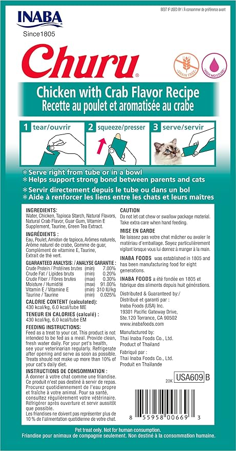 INABA Churu Cat Treats, Grain-Free, Lickable, Squeezable Creamy Purée Cat Treat/Topper with Vitamin E & Taurine, 0.5 Ounces Each Tube, 24 Tubes (4 per Pack), Chicken with Crab Recipe
