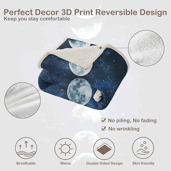 Sleepwish Lunar Eclipse Fleece Throw Blanket for Couch Chair Fuzzy Dark Blue Moon Phases Print Plush Sherpa Blanket for Kids, Throw(50" X 60")