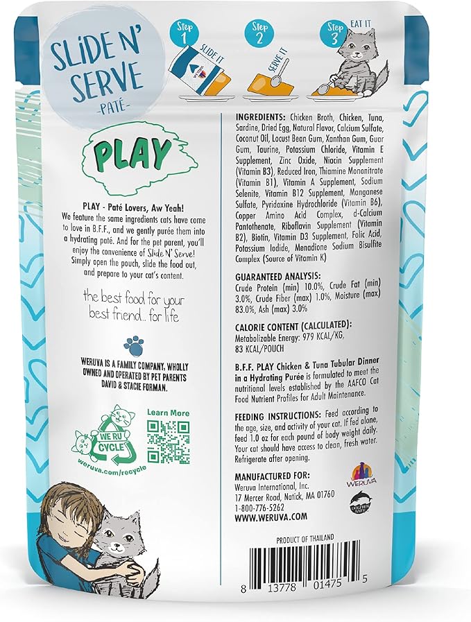 Weruva B.F.F. Play - Best Feline Friend Paté Lovers, Aw Yeah!, Chicken & Tuna Tubular with Chicken & Tuna, 3oz Pouch (Pack of 12)