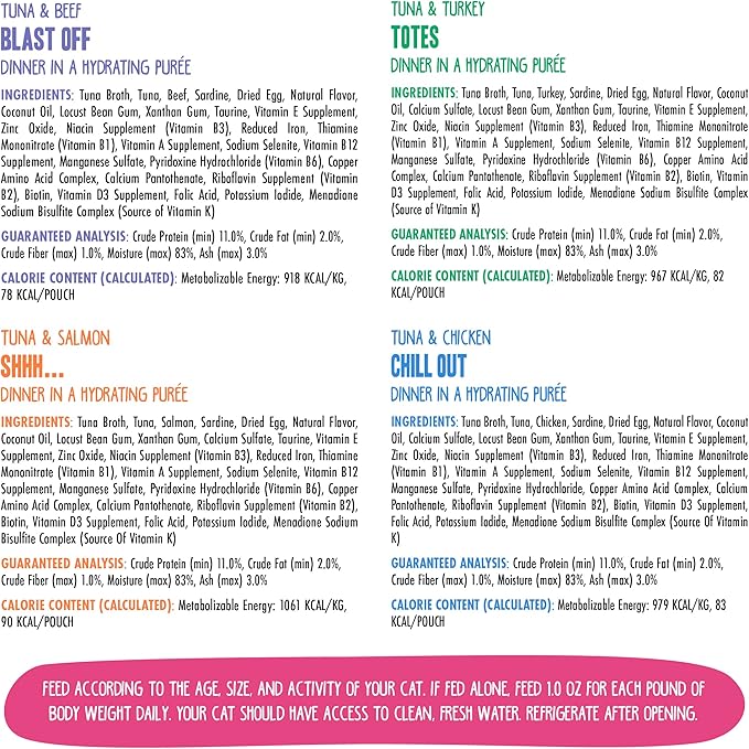 - Variety Pack includes 3 of each: Tuna & Chicken Chill Out, Tuna & Salmon Shhh, Tuna & Beef Blast Off, and Tuna & Turkey Totes.
