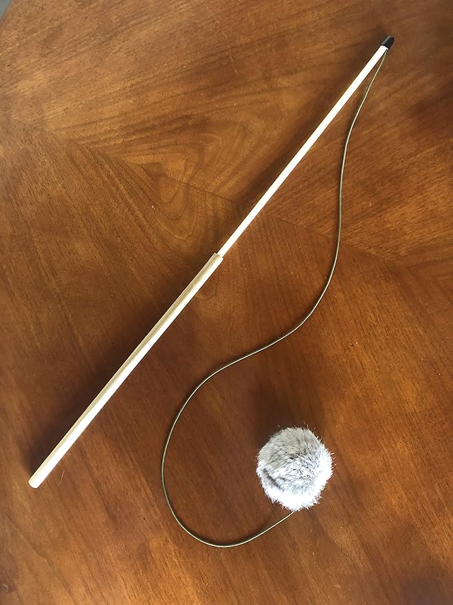 Natural Fur Pom Cat Wood Rod Teaser & Exerciser Wand for Cat & Kitten with Fluffy Fur Ball- Interactive Soft and Safe Feather-Like Real Fur Toy - Mouse Like Pelt Pom Assembled in The US