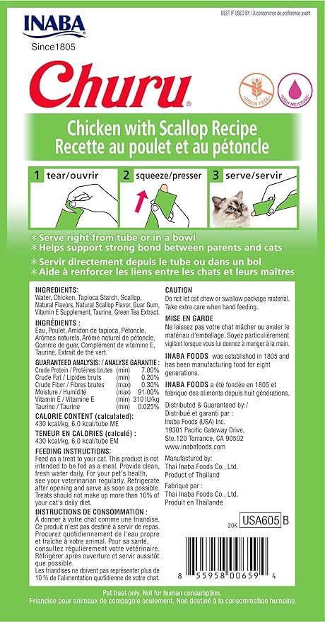 INABA Churu Cat Treats, Grain-Free, Lickable, Squeezable Creamy Purée Cat Treat/Topper with Vitamin E & Taurine, 0.5 Ounces Each Tube, 12 Tubes (4 per Pack), Chicken with Scallop Recipe