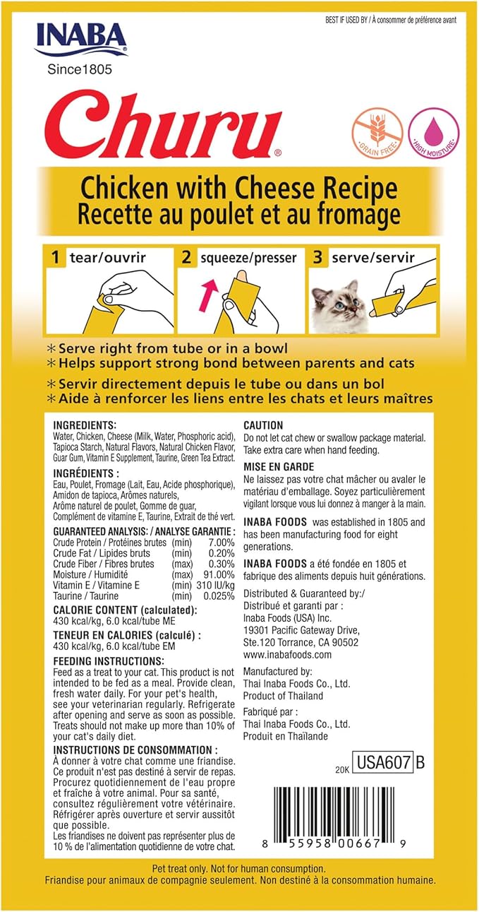 INABA Churu Cat Treats, Grain-Free, Lickable, Squeezable Creamy Purée Cat Treat/Topper with Vitamin E & Taurine, 0.5 Ounces Each Tube, 24 Tubes (4 per Pack), Chicken with Cheese Recipe
