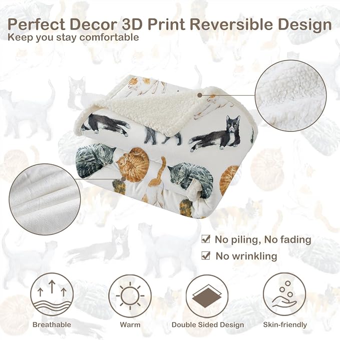 - Product Features: Crafted from high-quality microfiber fabric, featuring a beautifully printed flannel fleece on one side for ultra softness, and a plush polyester sherpa interior for ultimate warmth. The colorful cats pattern design is lively and adorable, adding a great deal of fun. Additionally, the blanket's edges are finely hemmed, enhancing both its aesthetics and durability.