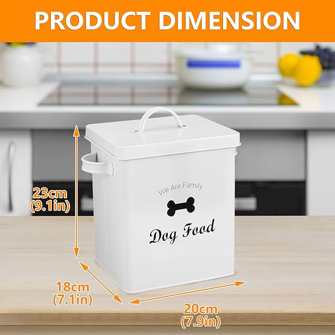 - 1.Pet FOOD STORAGE TIN: Keep your Pet food fresh, dry and perfectly stored to keep curious paws at bay by storing it in the Metal Pet Food Storage Tin. This large tin holds up to 8lbs of food or treats and has a sturdy metal lid to keep everything secure. We've included easy carry handles and a metal serving scoop that hooks on to the side for ease of use.