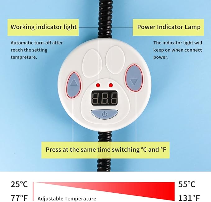 - 7 levels of temperature adjustable from 75 ℉-135℉(25℃ - 55℃), 2 modes of Fahrenheit and Celsius can be exchanged when pressing left and right adjustment keys at the same time, the display will show ℉ or ℃. Pets' body temperature is about 98 ℉, veterinarians advise 95-113℉ is the most comfortable temperature for pets in winter. 104℉ is recommended.
