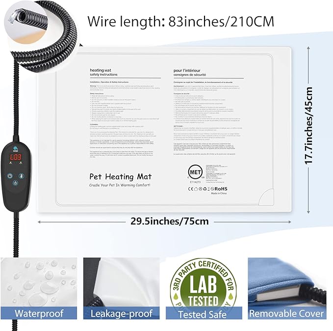 - 【Temperature Control & Safety】:In order to prevent the heating pad from overheating, we add a temperature control wire. If the temperature exceeds your set temperature, the thermostat stops heating and lowers the temperature. What’s more, if the temperature overheating by accident the temperature control wire will interrupt the circuit which can provide a safety pad for your pets.