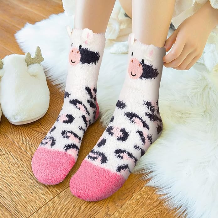 - 【Cow Print Fuzzy Socks】Each pair funny cute slipper floor fuzzy socks have an unique 3D cartoon design, including cat, sheep, giraffe, alpaca, llama, cow, bear, duck, dog, leopard, panda, raccoon. If you are a pet lovers, you will have so much fun when you wear these fun socks, such novelty silly patterned design add personality and vigour to your life.