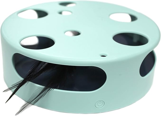 - SMART CAT TOY: The feather moves around its disc shape. While spinning, your cat will attempt to catch the feather through every hole. Set the power button on & watch as your cat attacks & has fun!