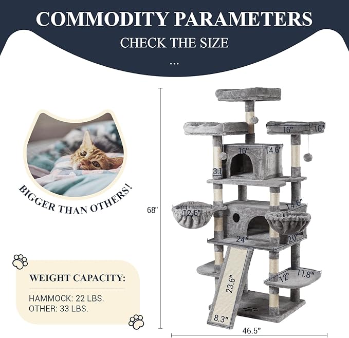 - Solid and Stable: The cat tree is made of marvelous particle board with skin-friendly plush covering, the strengthened base is strong enough to support 45 lb
