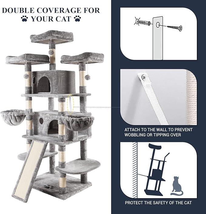 Allewie 68 Inches Cat Tree/House and Towers for Big Feline/Scratching Post/Multi-Level Large Kitty Climbing Tree with Condo/Light Grey