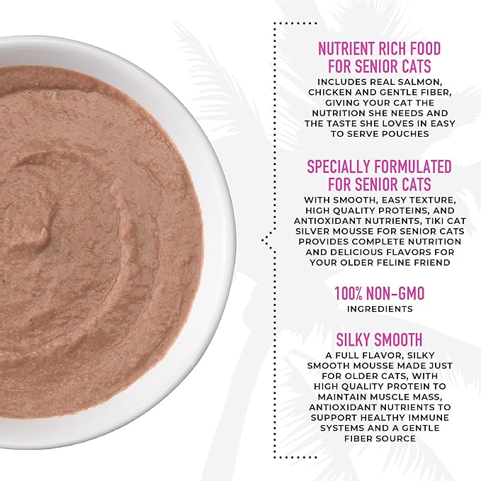 - SMOOTH MOUSSE TEXTURE - Made with high quality proteins and antioxidant nutrients, Tiki Cat Silver Mousse for senior cats provides complete nutrition and delicious flavors.