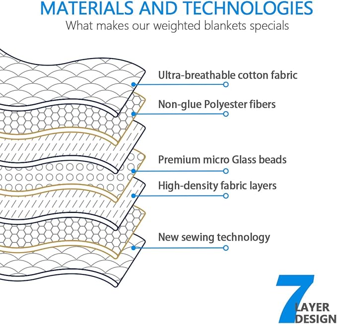 - Extra Safe for Him/Her: For the safety and comfort of people, this weighted blanket uses 100% breathable cotton, padded with fine glass beads that are non-toxic, no leakage, and antimagnetic. 7-layer pocket structure and strong stitching prevent beads leaking or shifting during sleep.