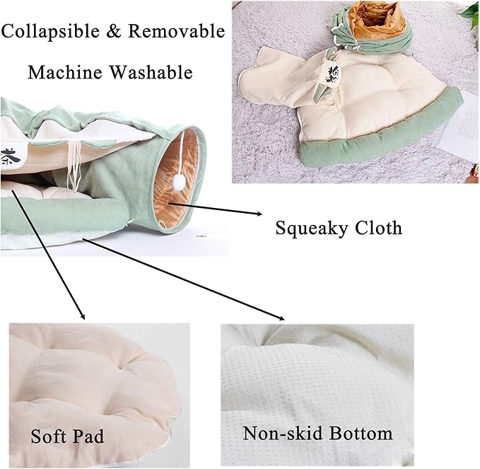 Cat Toys Collapsible Tunnel Bed Cozy Cave, Round Cuddle Snuggery Burrow Pet Litter House Bed Channel Removable Cover for Indoor Rabbits, Kittens and Dogs - Green