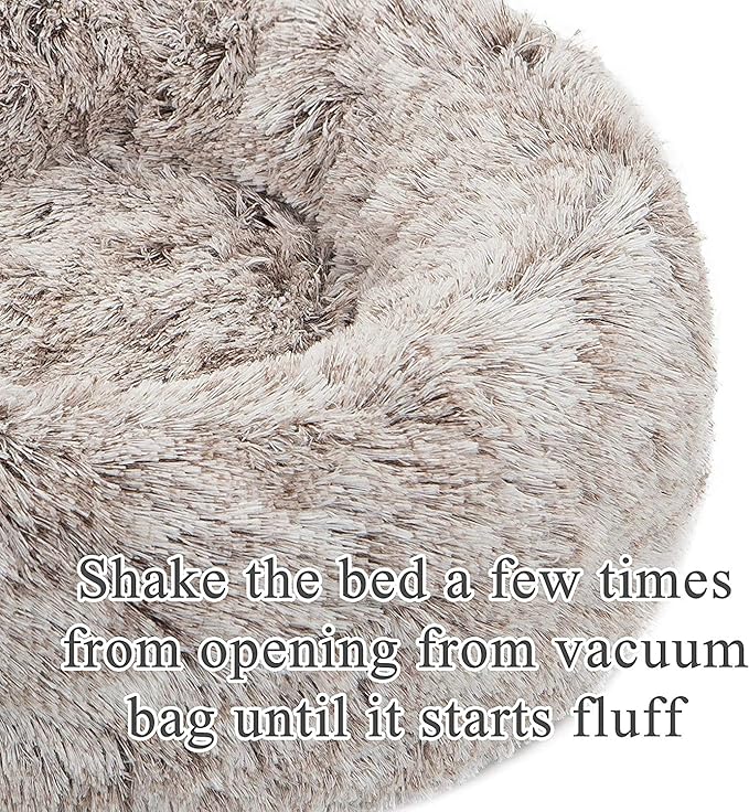 - [Superb Comfortablility] The Anti-Anxiety donut dog bed is designed for your pets comfortability. The round shape is to create a larger space and convenient for your ped to rest, the thick bottom provides the comfortable and warming cushion, and the raised rim gives the support for your pet's head and neck and the securiy as be surrounded. At last, the soft flaux fur will let your bark buddy sink in it, and take the immersive sleeping.