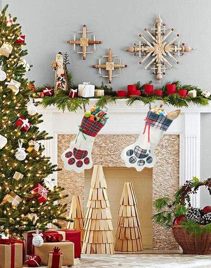 QBSM Cat Christmas Plaid Pet Paw Stockings with 26 Pcs Cat Toys for Cats and Kitten