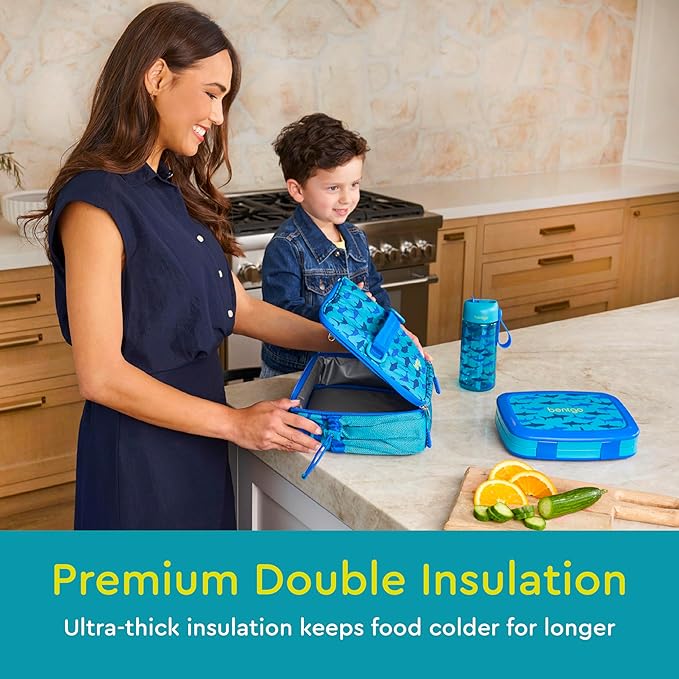 Bentgo Kids Lunch Bag - Durable, Double-Insulated Lunch Bag for Kids 3+; Holds Lunch Box, Water Bottle, & Snacks; Easy-Clean Water-Resistant Fabric & Multiple Zippered Pockets (Shark)