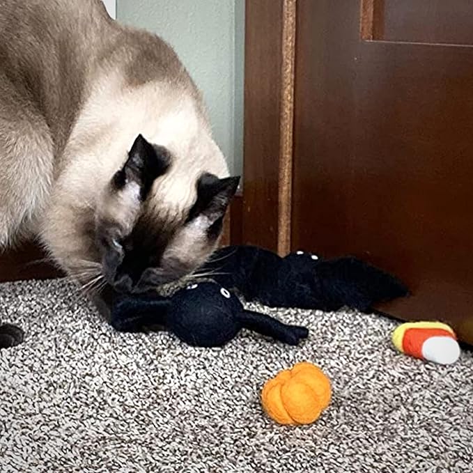 - Felted wool Halloween cat toys- bat, spider, pumpkin, and candy corn.