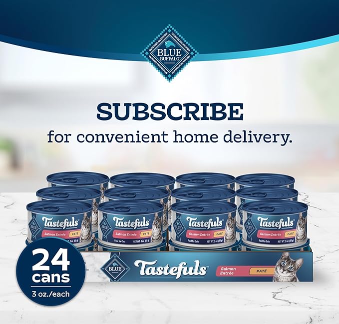 - Contains: Twenty-four (24) 3-oz. cans of BLUE Tastefuls Wet Cat Food, Salmon Entrées Paté
