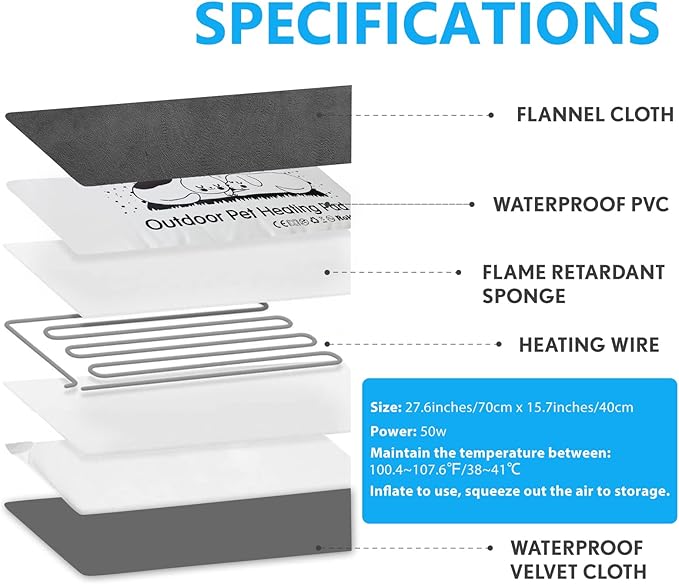 - 🐾ENERGY SAVING & SAFE 🐾 This outdoor heating pad is only 50w, thus it is more energy-savings. Anti-bite power cord design, the extra-long cord extends 5.91 feet with a 4.92 feet steel-encased chew guard. Furthermore, made of fireproof material, so it is really safe for you and your pets.