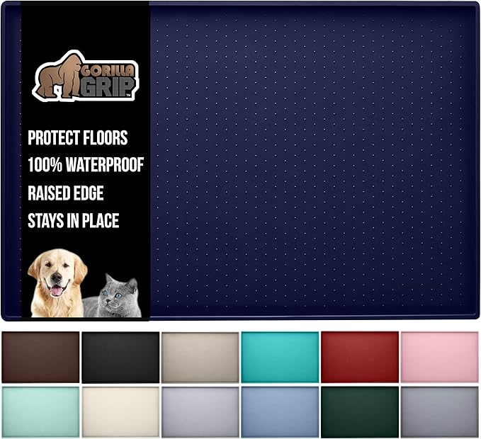 GORILLA GRIP 100% Waterproof Raised Edge BPA Free Silicone Pet Feeding Mat, Dog Cat Food Mats Contain Spills Protects Floors, Placemats for Cats and Dogs Water Bowl, Pets Accessories 28x18 Navy